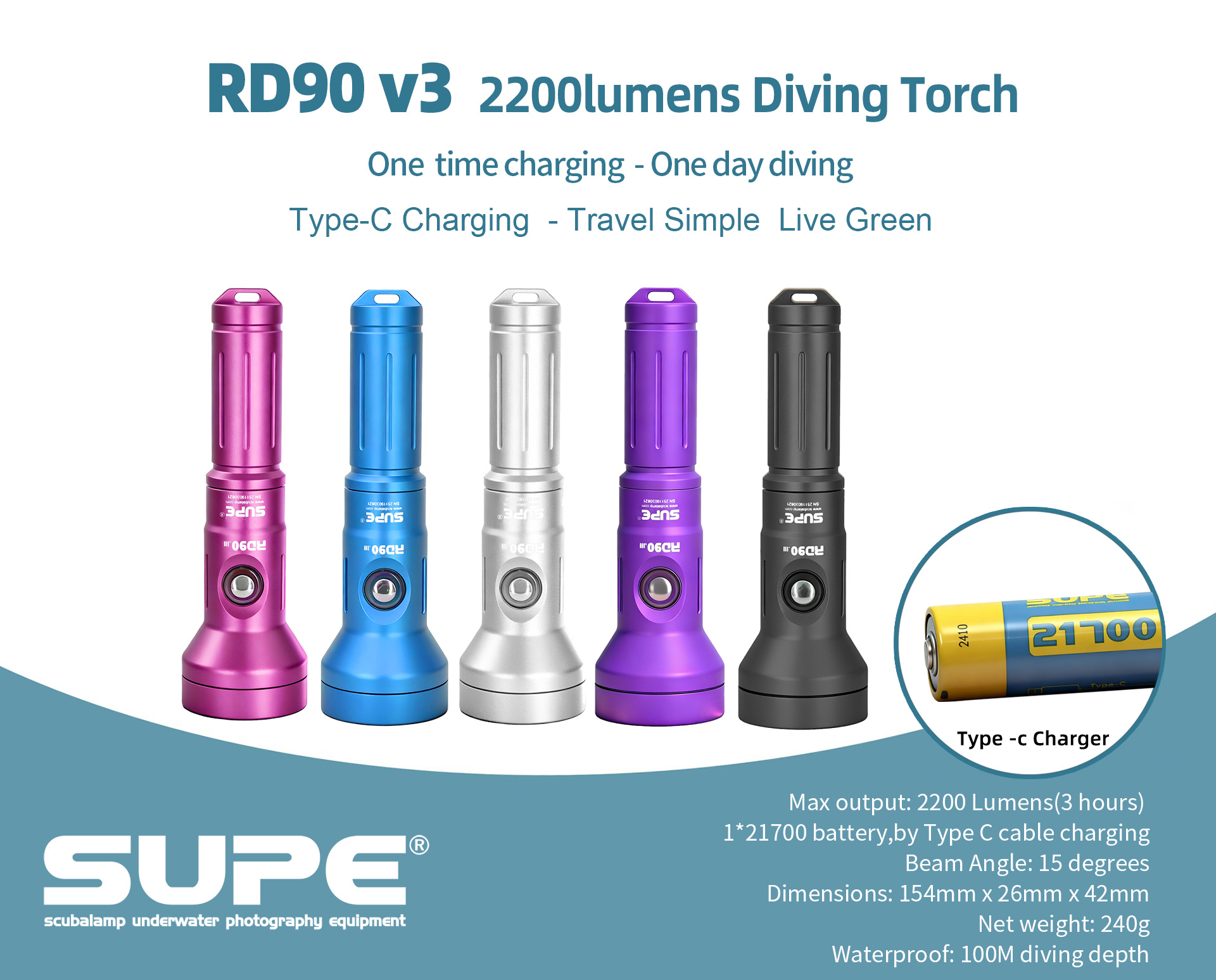 SUPE Scubalamp RD90 v3 LED Diving light for Recreational Diving,Tech Diving,Black-water searching - 2200 lumens at 3 hours